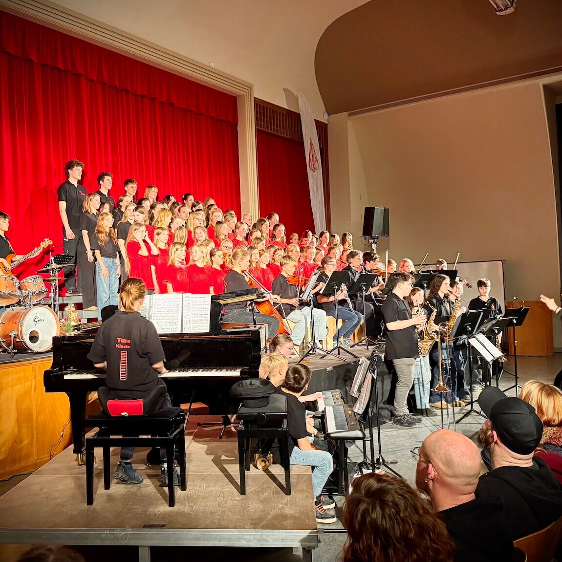 Alle Ensembles der OzD präsentierten die musikalischen Ergebnisse dieses kurzen Halbjahres in der zum Platzen gefüllten Aula. Die Chöre, Orchester, Big Band, Junior-Combo traten auf - und die Gitarren-AG feierte Premiere! Das bemerkenswert gut gelaunte Publikum spendete viel Applaus, eine Wohltat für alle Beteiligten - wir bedanken uns herzlich und wünschen allen harmonische Feiertage und alles Gute für alles Kommende im kommenden Jahr.